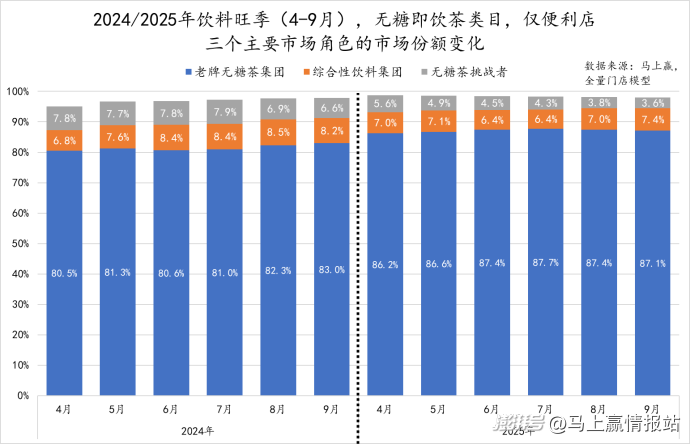 與此對應的則是渠道積累相對較薄弱、以便利店貨架為核心起盤的無糖茶挑戰(zhàn)者們,其在僅便利店業(yè)態(tài)中的市場份額,在2025年旺季開始的4月,還有5.6%(整體4.1%),但在2025旺季結束的9月,僅剩3.6%(整體3.4%)。