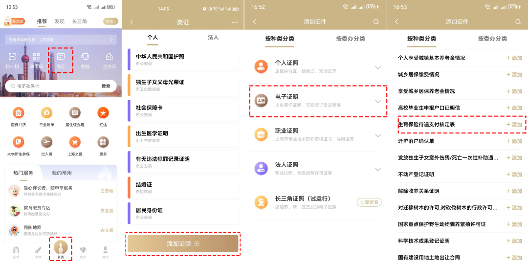 1、登錄“隨申辦市民云”APP→點(diǎn)擊首頁“亮證”→點(diǎn)擊“添加證照”→點(diǎn)擊“電子證照”,找到“生育保險(xiǎn)待遇支付核定表”并點(diǎn)擊“添加”;