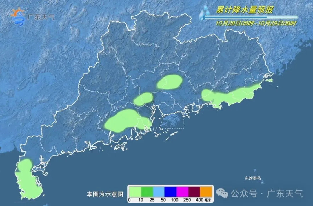 28日,粵西、粵東、珠江三角洲中南部、河源及梅州南部市縣多云間陰天,有分散小雨,其余市縣多云。