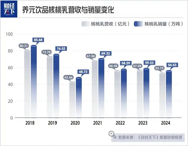 在養(yǎng)元飲品的發(fā)展中,主要依賴于王牌產(chǎn)品——六個核桃。近些年,養(yǎng)元飲品的核桃乳產(chǎn)品,銷量與收入都在下滑。從2018年到2024年,核桃乳的營收從80.21億元下滑至53.73億元,銷量從85.68萬噸下滑至56.53萬噸。