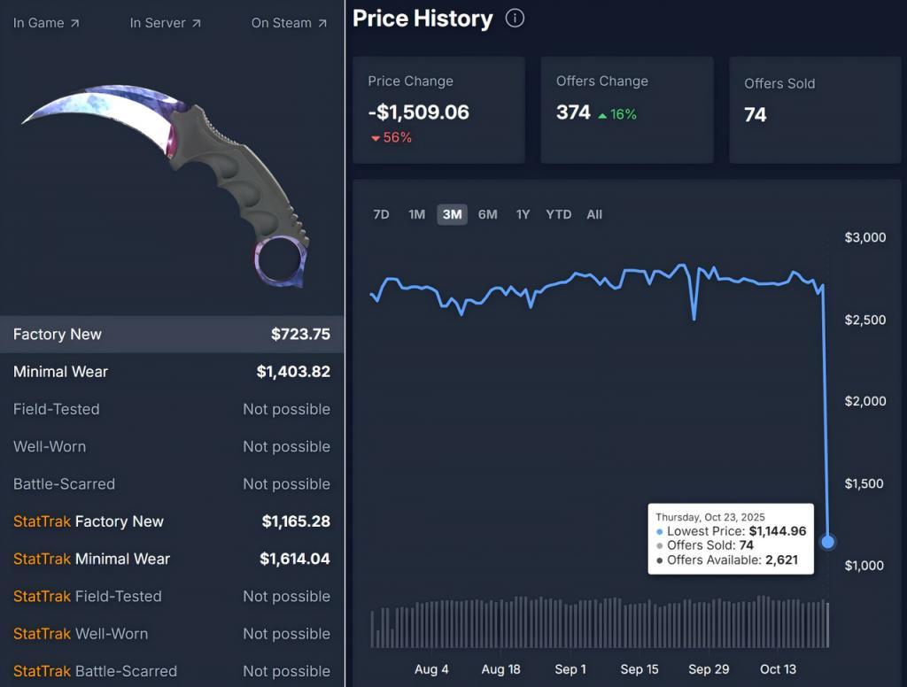 其中,高端稀有飾品價格集體跳水,例如一款“蝴蝶刀”飾品價格從32000元左右跌至約8000元,短短兩天跌去75%。