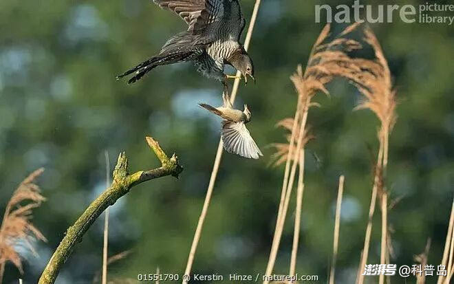 濕地葦鶯(A. palustris)正與大杜鵑打斗。 圖片來源:Kerstin Hinze / naturepl.com
