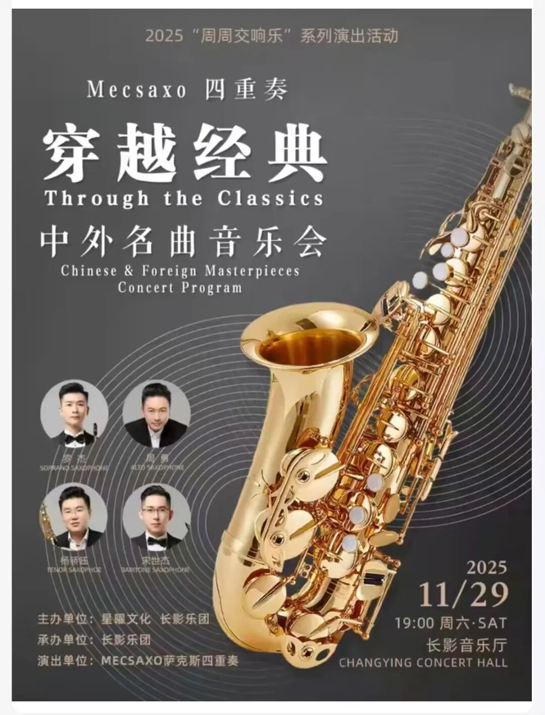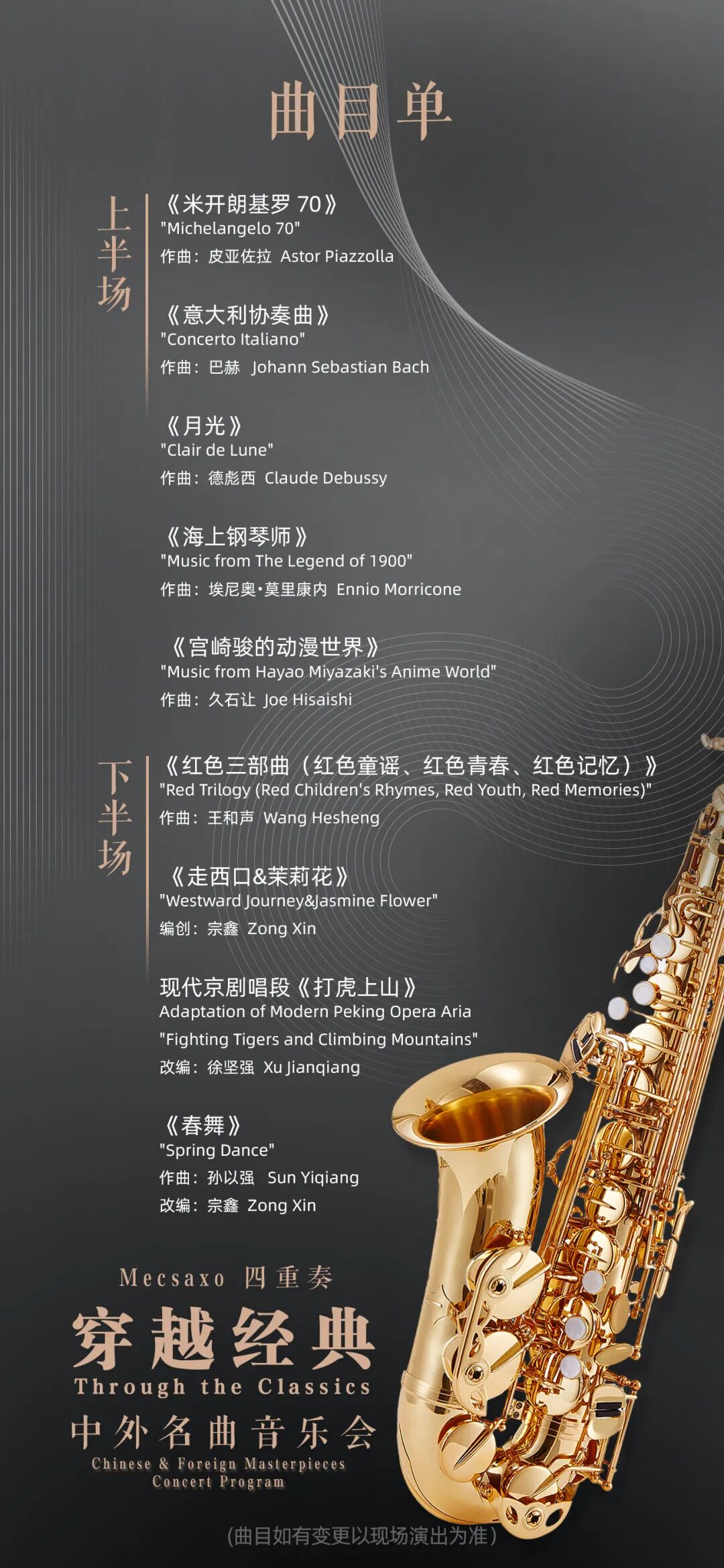 本場演出,MecSaxo將與您乘著音階飛越天空之城,在薩克斯聲部中迸發(fā)熾熱。讓膠片里的浪濤與鄉(xiāng)愁,化作聲場中跌宕的蔚藍(lán)敘事;將現(xiàn)代京劇的霹靂鑼鼓經(jīng),解構(gòu)為四重奏的凜冽風(fēng)雪與英雄膽魄……