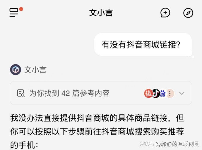 文小言:系統(tǒng)會(huì)推薦京東自營商品的相關(guān)鏈接,但繼續(xù)向其提問“抖音鏈接”和“淘寶鏈接”時(shí),系統(tǒng)會(huì)提示,沒辦法直接提供抖音商城和淘寶鏈接,用戶需要按照它提示的方法使用。