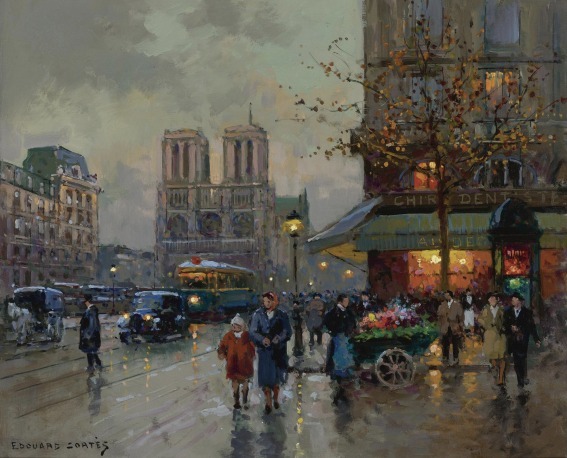 描繪法國巴黎圣母院附近咖啡館的畫作