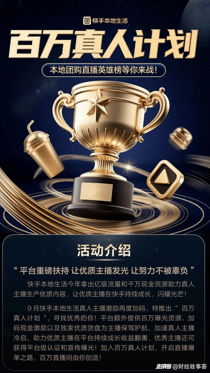 今年 9 月,快手還啟動(dòng)本地生活“百萬(wàn)真人計(jì)劃”,面向真人主播達(dá)人推出新一輪流量與現(xiàn)金扶持政策,通過(guò)流量現(xiàn)金資源等多重平臺(tái)支持,幫助優(yōu)質(zhì)主播突破冷啟動(dòng)瓶頸、實(shí)現(xiàn)穩(wěn)定成長(zhǎng)。