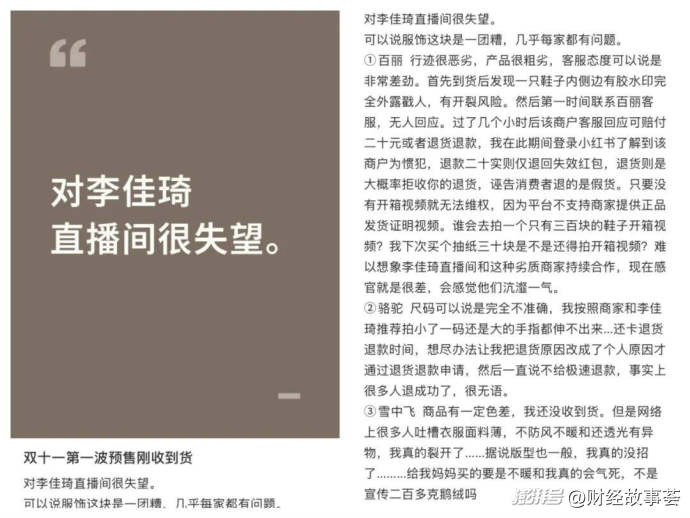小紅書(shū)上,用戶舟子君發(fā)帖稱,今年雙十一在李佳琦直播間購(gòu)買(mǎi)了百麗、駱駝和雪中飛的衣服,收貨后發(fā)現(xiàn)商品各有各問(wèn)題,退款體驗(yàn)也很差。