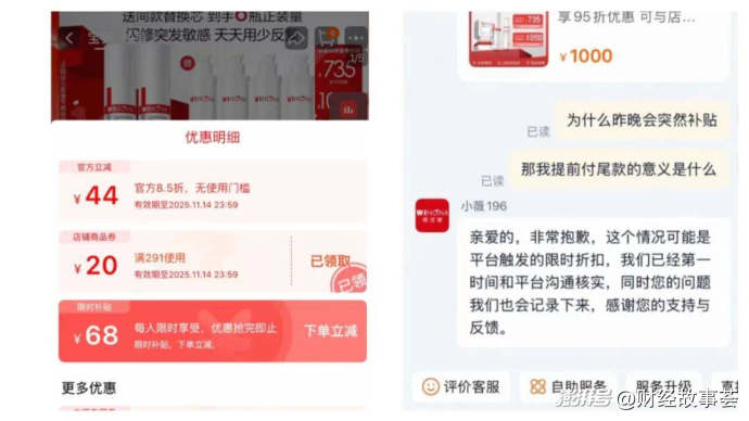 觀察社交媒體上的吐槽帖,像徐小姐這樣的“大冤種”不止一個(gè),而預(yù)售價(jià)高于現(xiàn)貨價(jià)的原因之一是,在 10 月 20 日付尾款的晚上,部分品牌方突然發(fā)放限時(shí)補(bǔ)貼,如薇諾娜官方旗艦店彈出59 元、68 元等額度的限時(shí)補(bǔ)貼,適用于店內(nèi)所有產(chǎn)品,因此消費(fèi)者使用補(bǔ)貼后總付款比李佳琦自播間的預(yù)售總價(jià)低。