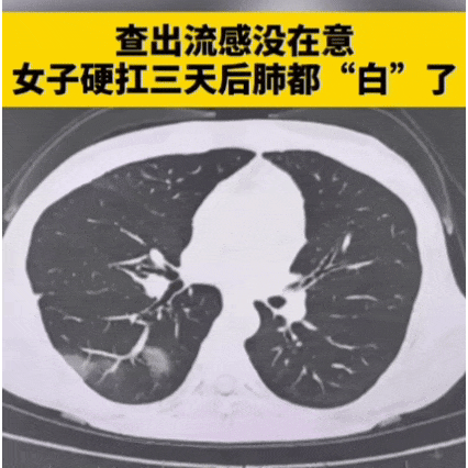 浙江杭州39歲的程女士,經(jīng)常熬夜爆肝工作,確診流感后,她拒絕了醫(yī)生住院治療的建議,回家“硬扛”了3天,好幾葉肺葉竟都出現(xiàn)了“白肺”癥狀……