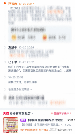 在這些“分鐘級收貨”案例中,可以發(fā)現(xiàn)基本上都是由菜鳥速遞來承接的,并且在“已下單”下面會(huì)附帶提示,已享受品牌和菜鳥聯(lián)合提供的“預(yù)售極速達(dá)服務(wù)”。同時(shí)這類服務(wù),針對的商品類別更多的是生活用品和護(hù)膚品居多,并且支持夜間派送,這一次的雙十一活動(dòng)卷的不只是價(jià)格,更是在快遞裝上“即時(shí)零售”的性質(zhì)。