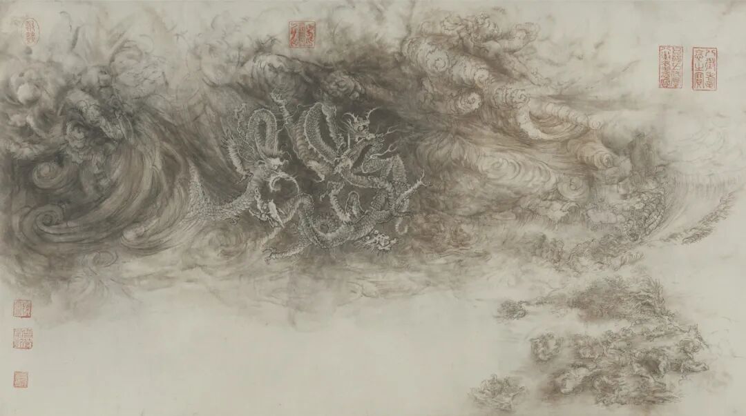 《達芬奇與中國龍》系列是徐累創(chuàng)作于2024年的重要作品,集中體現(xiàn)了藝術(shù)家以“物象”而非“風格”為切入點,展開跨文明對話的獨特方法論。徐累從達·芬奇手稿中提取風、雷、火山、云煙等自然力量的動態(tài)描繪,將其與宋代繪畫中墨龍的意象并置。達·芬奇的線條精準理性,捕捉自然現(xiàn)象的瞬間爆發(fā);宋人墨龍則以水墨氤氳傳遞神獸的幽隱威儀。二者雖分屬不同文化系統(tǒng),卻共同指向人類對不可控自然偉力的敬畏與想象。徐累的創(chuàng)作邏輯深植于中國傳統(tǒng)的“體用”關(guān)系:以達·芬奇的自然現(xiàn)象為“體”(物質(zhì)載體),以宋龍的精神象征為“用”(文化功能),通過并置重構(gòu)一種超越地域的視覺哲學。畫面中,旋風與龍鬃共舞,火山噴發(fā)與龍身扭動同構(gòu),暗合達·芬奇筆記中“力在暴力中誕生,在自由中消逝”的注釋。徐累以此揭示,東西方藝術(shù)在源頭上均試圖通過視覺符號馴服自然之力的混沌,而龍與風暴的共生,恰是文明對“力”的永恒追問的隱喻。該系列作品與《互山》《云世界》等作品共同構(gòu)建了徐累對“全球化退潮”后文明對話新范式的探索。徐累拒絕浮泛的“中西合璧”套路,轉(zhuǎn)而通過圖像考據(jù)與觀念嫁接,在具體物象中發(fā)掘深層的文化同構(gòu)性,為當代工筆注入跨學科的思想能量。