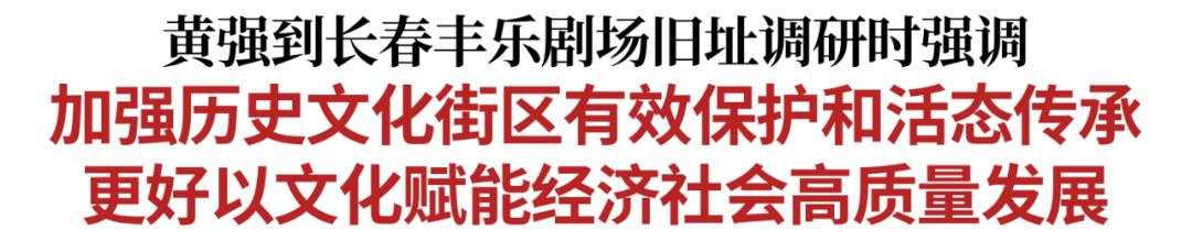 10月31日,省委書(shū)記黃強(qiáng)到長(zhǎng)春豐樂(lè)劇場(chǎng)舊址調(diào)研。他強(qiáng)調(diào),要深入學(xué)習(xí)領(lǐng)會(huì)、認(rèn)真貫徹落實(shí)黨的二十屆四中全會(huì)精神,著力加強(qiáng)歷史文化街區(qū)有效保護(hù)和活態(tài)傳承,更好以文化賦能經(jīng)濟(jì)社會(huì)高質(zhì)量發(fā)展,推動(dòng)吉林全面振興取得新突破。