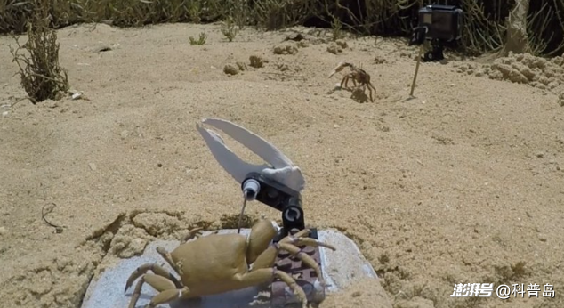這只“機(jī)蟹”由研究人員通過(guò)手機(jī)藍(lán)牙上的APP進(jìn)行遠(yuǎn)程遙控,可以模仿求偶中的雄性招潮蟹,做出標(biāo)準(zhǔn)的揮螯動(dòng)作。