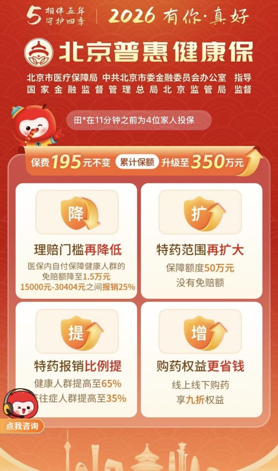 2026年度“北京普惠健康保”作為“北京市民專屬”的補(bǔ)充醫(yī)保,將繼續(xù)以普惠的價格、堅實的保障,為更多首都家庭的健康幸福保駕護(hù)航。