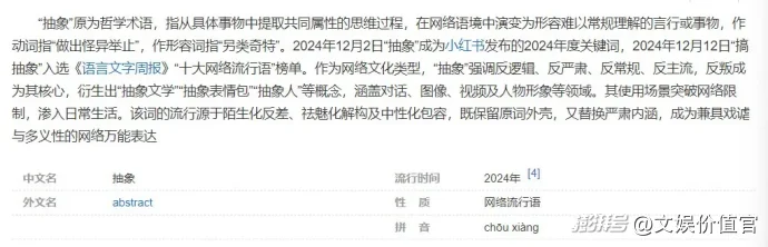 “玩抽象”并非今年才出現(xiàn),2024年12月2日,小紅書發(fā)布的2024年度關(guān)鍵詞就是“抽象”。據(jù)小紅書數(shù)據(jù)顯示,平臺與“抽象”相關(guān)的筆記內(nèi)容超過1000萬條,“搞抽象”的評論數(shù)量達(dá)1.6億條,覆蓋表情包、熱梗、語錄等創(chuàng)意內(nèi)容,顯示出年輕群體對該文化現(xiàn)象的積極參與和高度活躍。