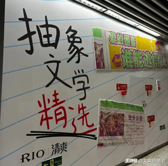 正如RIO就在重慶地鐵站投放了“搞抽象”的廣告,畫面上手撕報紙的創(chuàng)意,乍一看像是小孩子在玩過家家,正是這種反差讓人不禁停下腳步多看幾眼。而典型的發(fā)瘋文學(xué)的文案,更是抓住了路人眼球,這則廣告前甚至成為眾多網(wǎng)友的網(wǎng)紅打卡地。