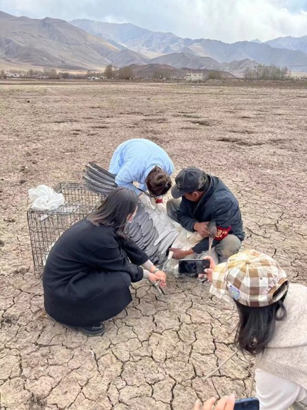 那曲市色尼區(qū)羅瑪鎮(zhèn),獸醫(yī)扎西德吉和林草局工作人員正在為一只受傷的黑頸鶴進行檢查。