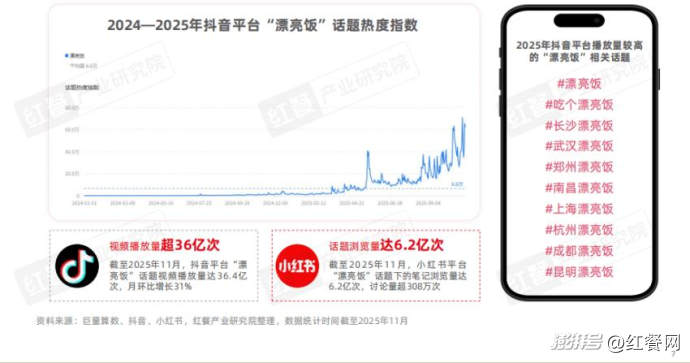 近日,紅餐產(chǎn)業(yè)研究院聯(lián)合安佳專業(yè)乳品共同發(fā)布《餐飲行業(yè)“漂亮飯”發(fā)展報(bào)告2025》(以下簡稱《報(bào)告》)?!秷?bào)告》顯示,今年以來“漂亮飯”在社交平臺(tái)的關(guān)注度正在持續(xù)攀升。以抖音平臺(tái)為例,“漂亮飯”相關(guān)話題視頻播放量已突破36億次;而在小紅書平臺(tái),“漂亮飯”的聲量更是居高不下,截至11月,“漂亮飯”話題下,相關(guān)筆記瀏覽量已達(dá)6.2億次,討論量也超308萬次。