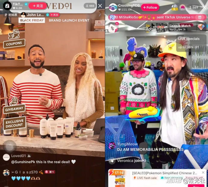 在線上,格萊美獎得主John Legend在TikTok Shop開啟了直播帶貨,美國知名DJ Steve Aoki也以夸張造型出鏡,在TikTok Shop上帶貨潮玩類商品,吸引了大批潮玩愛好者與電音粉絲……