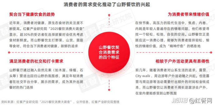 山野餐飲的興起主要源于其滿足了消費(fèi)者多方面的消費(fèi)需求。一方面,近年來,消費(fèi)者對(duì)健康、原生態(tài)食材的關(guān)注度不斷提高;另一方面,快節(jié)奏生活促使消費(fèi)者對(duì)“療愈場(chǎng)景”的需求不斷,而山野餐飲通過山野食材、自然元素等打造的沉浸式場(chǎng)景,能夠?yàn)橄M(fèi)者提供輕松、愉悅的情緒價(jià)值,也能滿足年輕消費(fèi)者在社交平臺(tái)分享、展示的需求。此外,相較于露營(yíng)、旅行等高成本活動(dòng),山野餐飲對(duì)時(shí)間和場(chǎng)地的要求不高,為追求山野自然的消費(fèi)者提供了更易得的選擇。