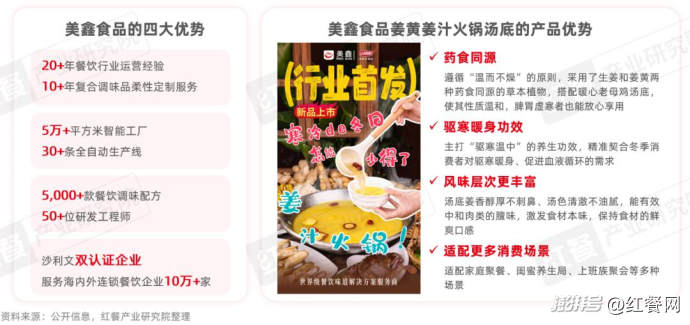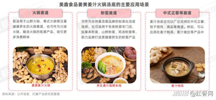 紅餐產(chǎn)業(yè)研究院進(jìn)一步了解到,姜湯火鍋湯底具有獨(dú)特的風(fēng)味和養(yǎng)生功效,適合應(yīng)用在多種餐飲場(chǎng)景中,如姜湯面、姜湯米線、姜湯雞煲、姜湯調(diào)蛋等。以美鑫食品推出的姜黃姜汁火鍋湯底為例,它不僅可以應(yīng)用到火鍋賽道,還可以靈活應(yīng)用到粉面、餃子餛飩、中式正餐等賽道。