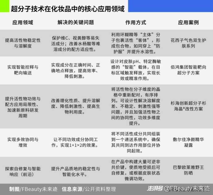 超分子技術(shù)的潛力遠(yuǎn)不止于當(dāng)下的面部護(hù)膚。其本質(zhì)在于調(diào)控分子在時(shí)間和空間維度的行為,為跨品類應(yīng)用打開了思路。