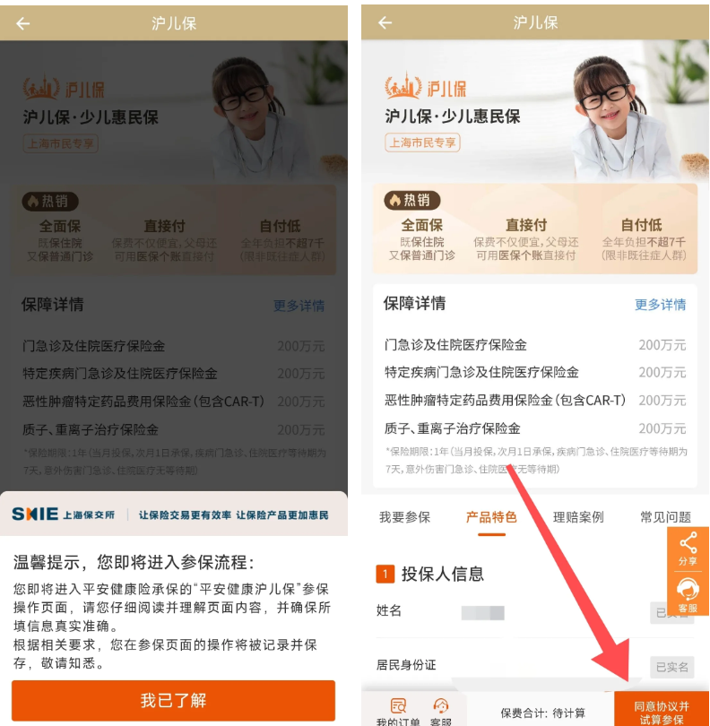 第二步:點擊右下角按鈕“同意協(xié)議并參保”,稍后在跳出窗口點擊“我已了解”后跳轉(zhuǎn)至參保頁面。