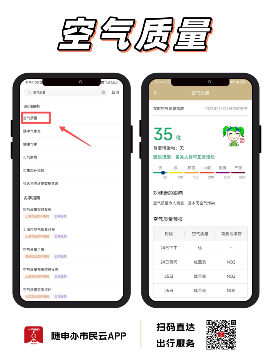 “隨申辦市民云”APP【空氣質(zhì)量】服務(wù),也可以輕松查詢到AQI指數(shù)和空氣污染物濃度。