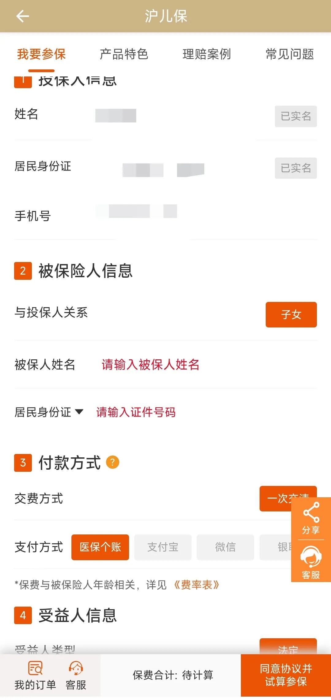 第三步:填寫投保人信息、被保險人信息、付款方式等信息后,點擊“同意協(xié)議并試算參?!薄?/p>