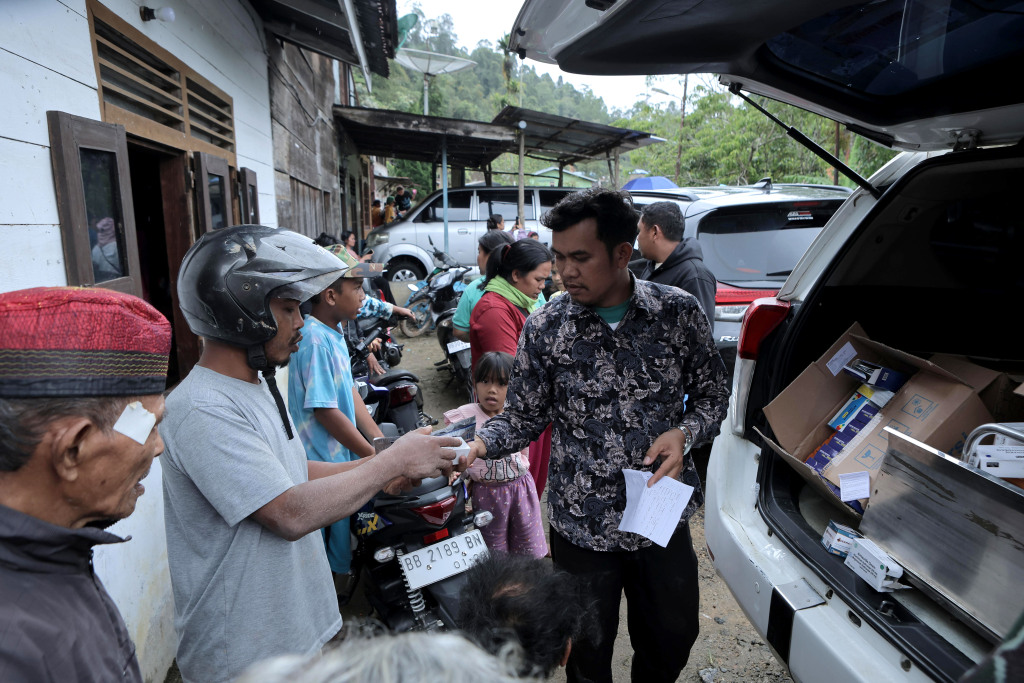 11月27日,在印度尼西亞蘇門答臘島北蘇門答臘省,工作人員為村民分發(fā)藥物。