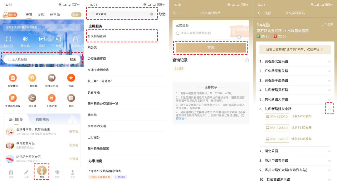 登錄“隨申辦市民云”APP→首頁搜索框中輸入關(guān)鍵字“公交”→點(diǎn)擊“公交到站查詢”進(jìn)入服務(wù)頁面,輸入公交路線名稱,即可查詢公交車到站時(shí)間。