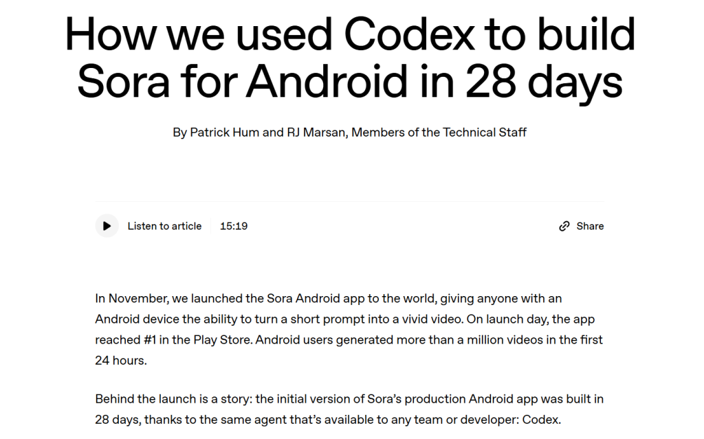 4名工程師+智能體+28天=安卓版Sora?OpenAI給出了未來軟件開發(fā)“樣本”