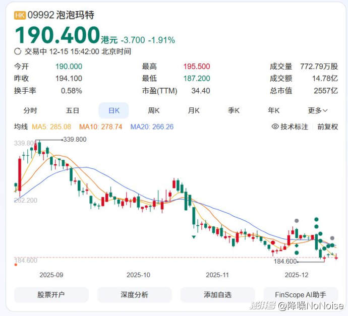 ▲截至發(fā)稿日泡泡瑪特股價已從歷史最高339港元跌至190港元