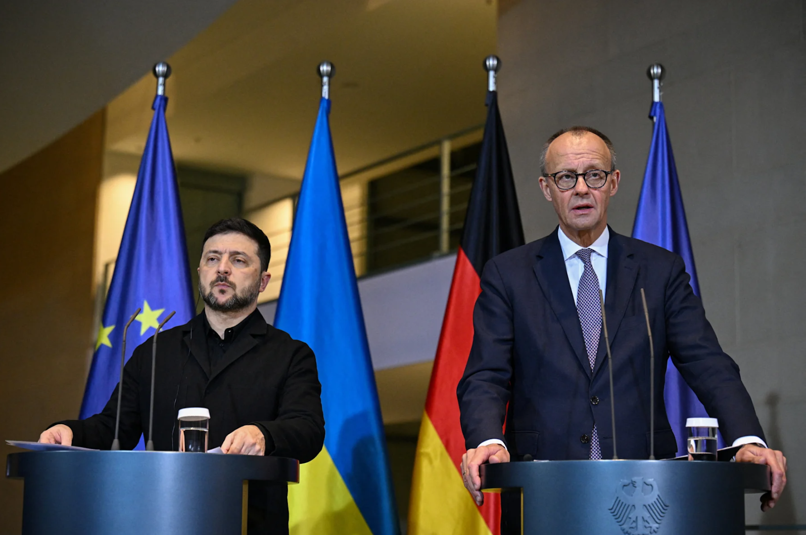 當(dāng)?shù)貢r(shí)間15日,烏克蘭總統(tǒng)澤連斯基與德國(guó)總理默茨在柏林舉行聯(lián)合記者會(huì)