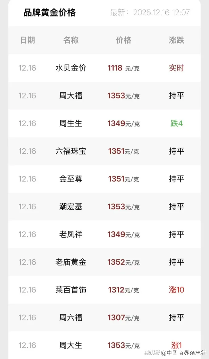 國內(nèi)品牌金飾價格多日連漲態(tài)勢也隨之終結(jié)。12月16日,周生生足金飾品報1349元/克,較昨日的1353元/克跌4元/克,終結(jié)自12月10日起的五連漲;老廟黃金足金飾品報1352元/克,較昨日保持不變;老鳳祥足金飾品報1349元/克,較昨日保持不變。