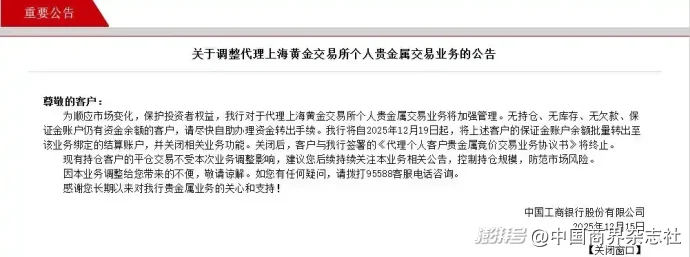 12月15日,工商銀行官網(wǎng)發(fā)布《關(guān)于調(diào)整代理上海黃金交易所個人貴金屬交易業(yè)務(wù)的公告》稱:“無持倉、無庫存、無欠款、保證金賬戶仍有資金余額的客戶,請盡快自助辦理資金轉(zhuǎn)出手續(xù)?!弊?025年12月19日起,將上述客戶的保證金賬戶余額批量轉(zhuǎn)出至該業(yè)務(wù)綁定的結(jié)算賬戶,并關(guān)閉相關(guān)業(yè)務(wù)功能。