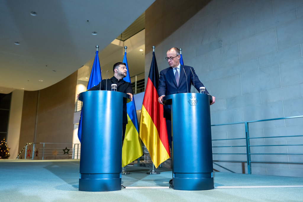 當(dāng)?shù)貢r(shí)間12月15日,德國(guó)柏林,德國(guó)總理默茨(右)與烏克蘭總統(tǒng)澤連斯基(左)在總理府出席新聞發(fā)布會(huì)。視覺(jué)中國(guó) 圖