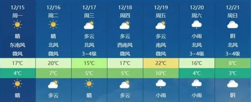 預(yù)計到12月18日至19日前后,東北、江淮、江南等地的氣溫將達(dá)到近期高點,局地氣溫偏高,升溫幅度可達(dá)10℃左右,長江中下游多地的溫暖程度將如同回到11月上旬甚至10月下旬。