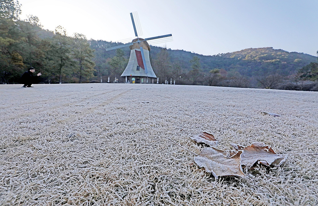 2025年12月15日,杭州,太子灣公園的草坪上寒霜覆蓋,宛如鋪了一層白雪。