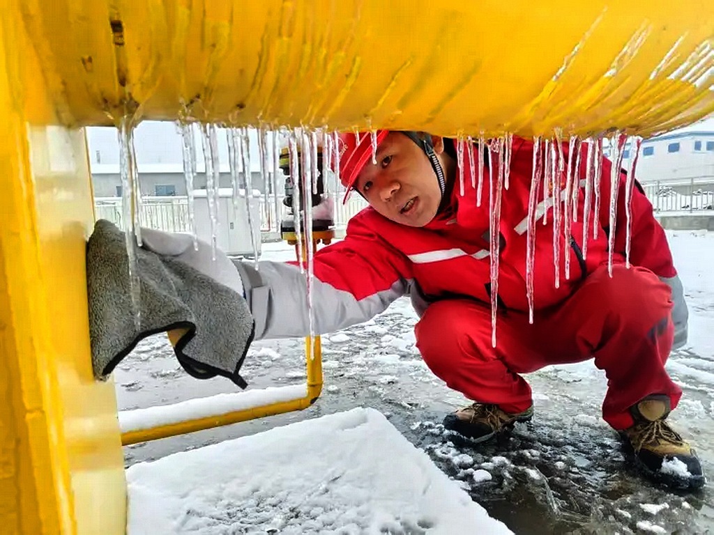 2025年12月13日,山東濱州,中國石化天然氣分公司山東實華公司崗位員工在風(fēng)雪中進(jìn)行天然氣外輸保供工作。