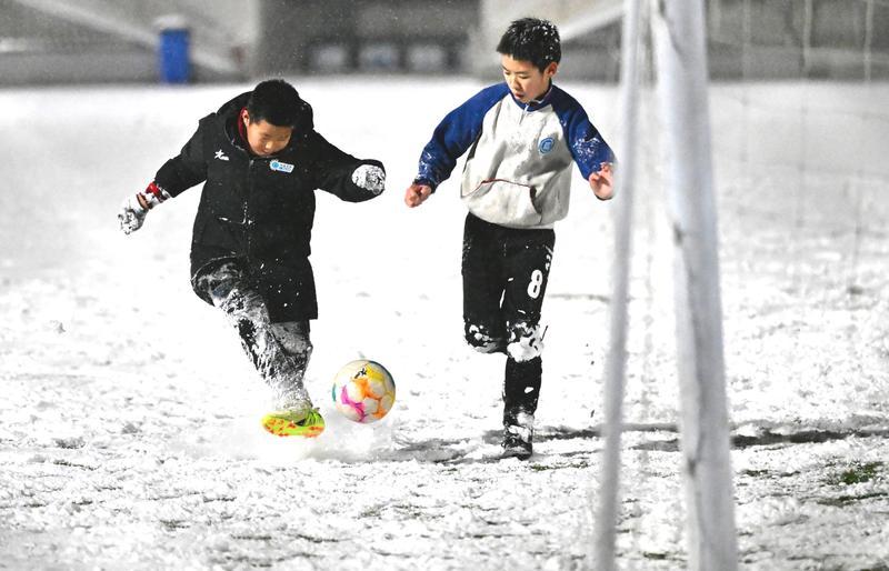 2025年12月12日晚,孩子們在北京月壇體育中心參加足球訓(xùn)練。當(dāng)日,北京迎來今冬初雪。