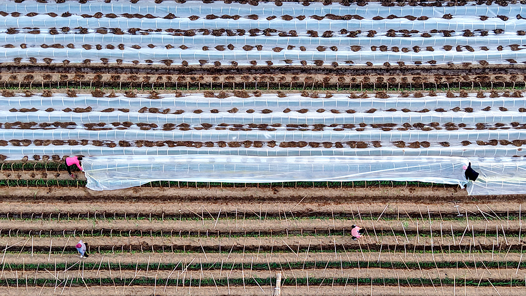 2025年12月11日,在山東省臨沂市平邑縣地方鎮(zhèn),村民為種植的蔬菜幼苗覆蓋保溫薄膜(無人機(jī)照片)。中央氣象臺12月10日發(fā)布寒潮、大風(fēng)藍(lán)色預(yù)警,預(yù)計10日至13日我國大部地區(qū)將自西向東出現(xiàn)大風(fēng)降溫。同一天,中國氣象局啟動重大氣象災(zāi)害(寒潮、大風(fēng)、暴雪)四級應(yīng)急響應(yīng)。