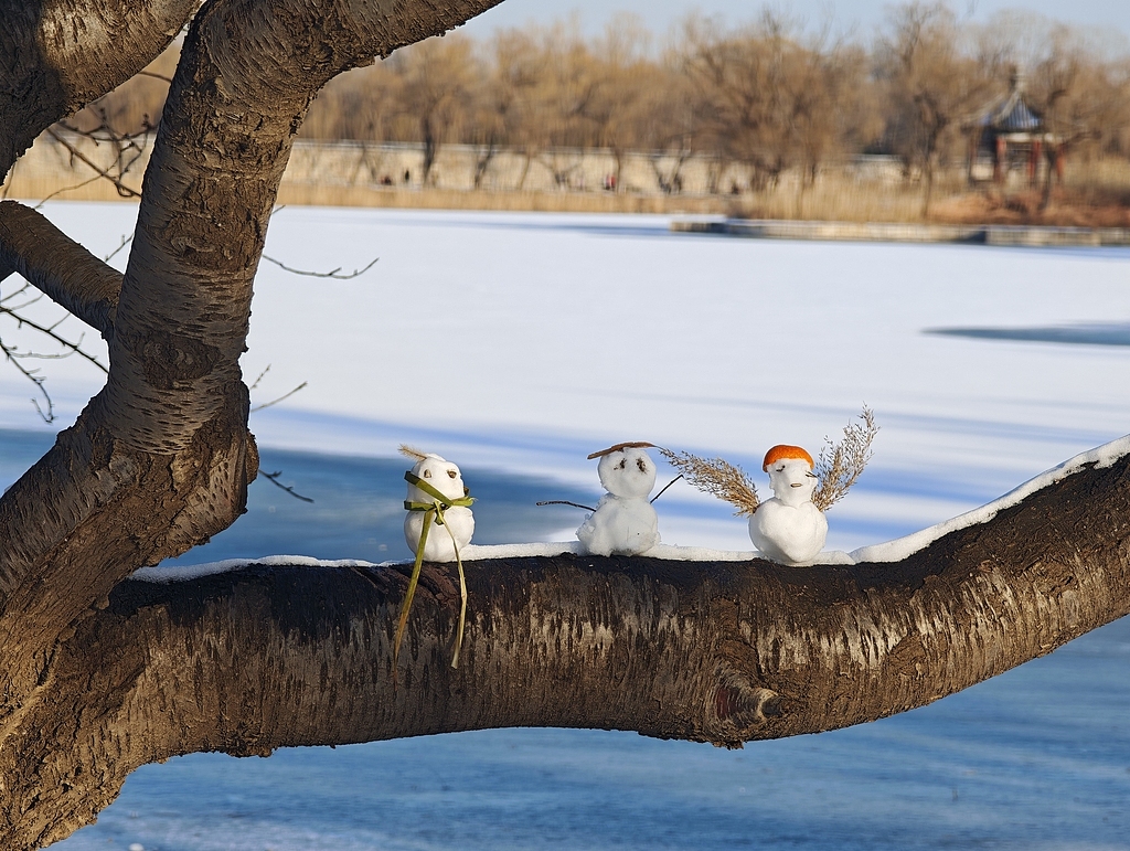 2025年12月14日,北京頤和園,初雪過后,樹枝上游客堆的小雪人。