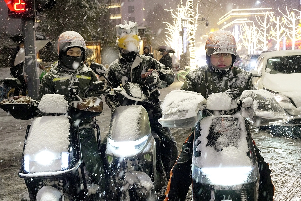 2025年12月12日,河南鄭州迎來入冬初雪。夜晚的鄭州,外賣小哥穿梭于城市的大街小巷,忙于配送。當(dāng)天,鄭州市氣象臺發(fā)布暴雪藍(lán)色預(yù)警信號。 中新社記者 李超慶 攝