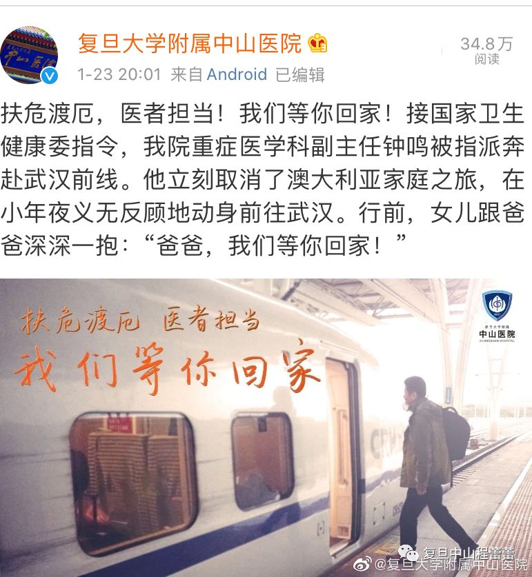 1月23日,我院重癥醫(yī)學(xué)科鐘鳴醫(yī)生作為排頭兵,于小年夜義無反顧告別家人啟程前往武漢。接下去又連續(xù)有同事馳援前線。我們?yōu)槿ヒ痪€戰(zhàn)斗的同事驕傲,也為他們心生擔(dān)憂。