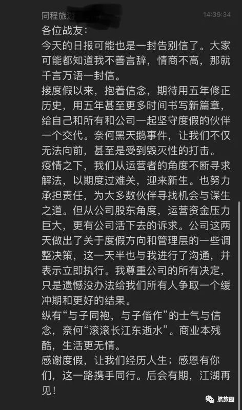 而在今日又流傳出一份來(lái)自同程旅游度假板塊的內(nèi)部信函,也有來(lái)自度假業(yè)務(wù)的同程員工收到公司的解聘通知,補(bǔ)償N+1個(gè)月的工資。(N為入職年限)