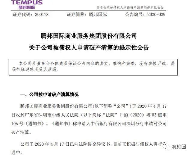 4月21日晚間,騰邦國(guó)際發(fā)布公告稱,公司被債權(quán)人申請(qǐng)破產(chǎn)清算,目前已向法院提交異議書。據(jù)悉,由于機(jī)票代理等業(yè)務(wù)受疫情沖擊,騰邦國(guó)際一季度預(yù)虧近7000萬。