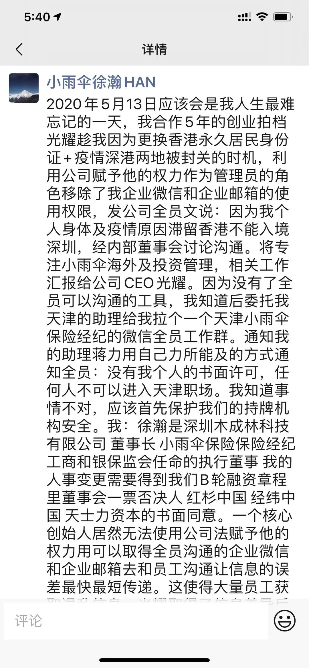 ?三言財經(jīng)消息,今日有爆料稱,小雨傘保險董事長徐瀚凌晨3點在朋友圈發(fā)文稱趁自己滯留香港之際,創(chuàng)業(yè)伙伴、公司CEO光耀“趁機奪權(quán)”,并“奪取”了小雨傘保險的財務(wù)章和營業(yè)執(zhí)照。