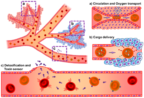 這些合成紅細胞成功攜帶了不同的血紅蛋白、抗癌藥物、毒素傳感器和磁性納米顆粒等。而這其中的每一種都可能代表這些細胞的不同潛在用途,包括運送氧氣、運送藥物、感應毒素和允許外部操縱等。而在所有的脊椎動物及若干無脊椎動物中,其血紅素(無脊椎動物也有時是蚯蚓紅血朊)包含在特定的細胞中來進行其機能活動,這種血球稱為紅細胞。其它的血細胞,如白血球,則是免疫細胞。