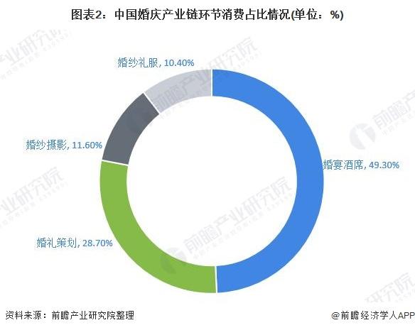 在我國(guó)婚慶產(chǎn)業(yè)核心環(huán)節(jié)中,婚宴酒席消費(fèi)占比一直居高不下,具有更大的交易潛力,婚禮策劃消費(fèi)位列第二。